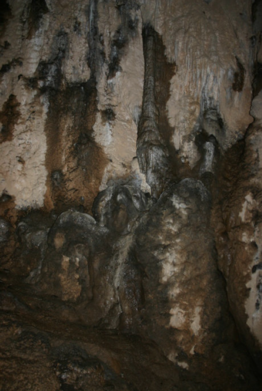 mezzi e pure residui carboniosi degli scarichi, si sta ricoprendo di una patina di neoformazione di calcite bianca. Il bianco è dovuto al Carbonato di Calcio praticamente puro che si sta depositando. Generalmente nelle grotte turistiche raccontano la leggenda che l’accrescimento delle concrezioni è di un centimetro ogni 100-1000 o anche di più anni, questi numeri sono variabili secondo il livello di fantasia delle guide.